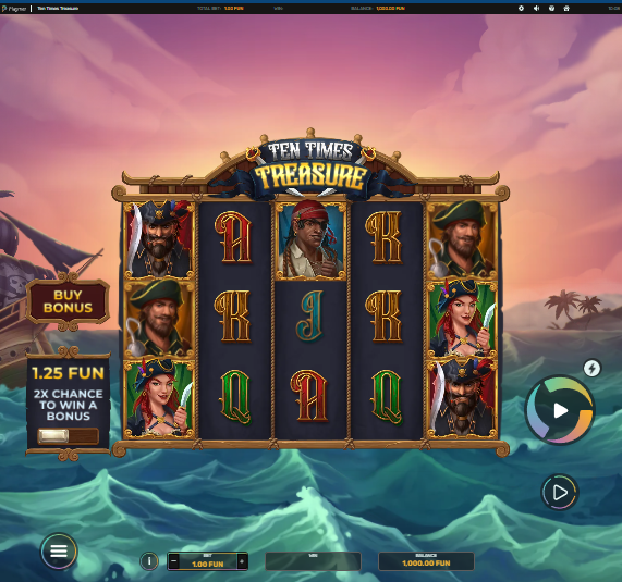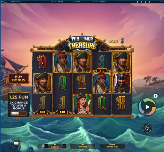 Set sail for adventure with Playmer’s “Ten Times Treasure,” a 5-reel, 3-row online slot featuring 243 ways to win. This pirate-themed game immerses players in a high-seas quest for riches, characterized by its medium volatility and a Return to Player (RTP) of 96.01%. The core gameplay revolves around a unique Respin feature where every win locks winning symbols, triggering respins with multipliers that escalate by 10x for each subsequent win with that symbol, reaching up to x100. Triggering Free Spins with Scatter symbols allows these accumulated multipliers to persist throughout the bonus round, with the potential to reach an impressive x1000. Players can also utilize the Ante Bet for a doubled chance at Free Spins or opt for the Bonus Buy feature to directly enter the lucrative free spins round.