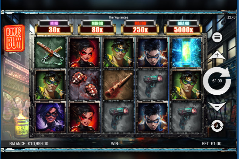 The symbols within “The Vigilantes” are intrinsically linked to its core theme of underground crime-fighting. Lower-value symbols are represented by items one might associate with such activities: what appear to be bloodied baseball bats, nunchaku, and a somewhat futuristic sidearm. These are not mere placeholders; they ground the game in its gritty reality. The higher-value symbols are the vigilantes themselves: a female character with a purple and black motif, exuding a focused intensity, and a male character in green and yellow, conveying readiness. Their expressions and attire reinforce the serious, almost grim, nature of their nocturnal pursuits.