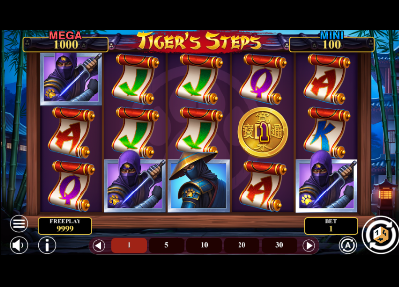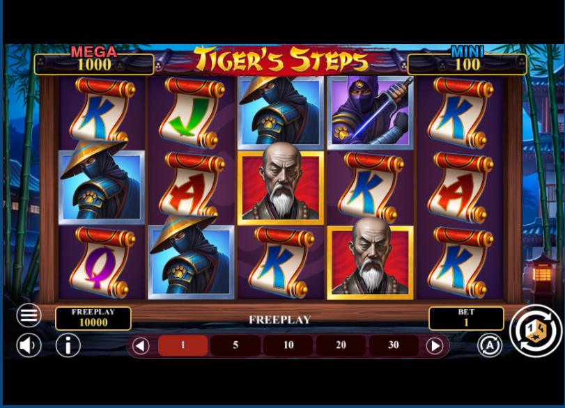 Tiger’s Steps by 1Spin4Win is a video slot focused on the theme of ninja martial arts. The game establishes a clandestine atmosphere, set within a moonlit village that emphasizes discipline and stealth. It functions on a 5×3 reel grid using a 243-ways-to-win system, which facilitates a consistent stream of base game action. The core of the gameplay, however, is its singular Hold & Win bonus feature. This round is triggered by landing three or more golden coin symbols, initiating a sequence of three respins. The objective is to collect additional sticky coins, each of which resets the respin counter back to three. This bonus game is the exclusive path to winning the slot’s fixed Mini (100x) and Mega (1000x) jackpots. The game’s design results in a concentrated experience where the most significant potential is locked within this intense respin mechanic.
