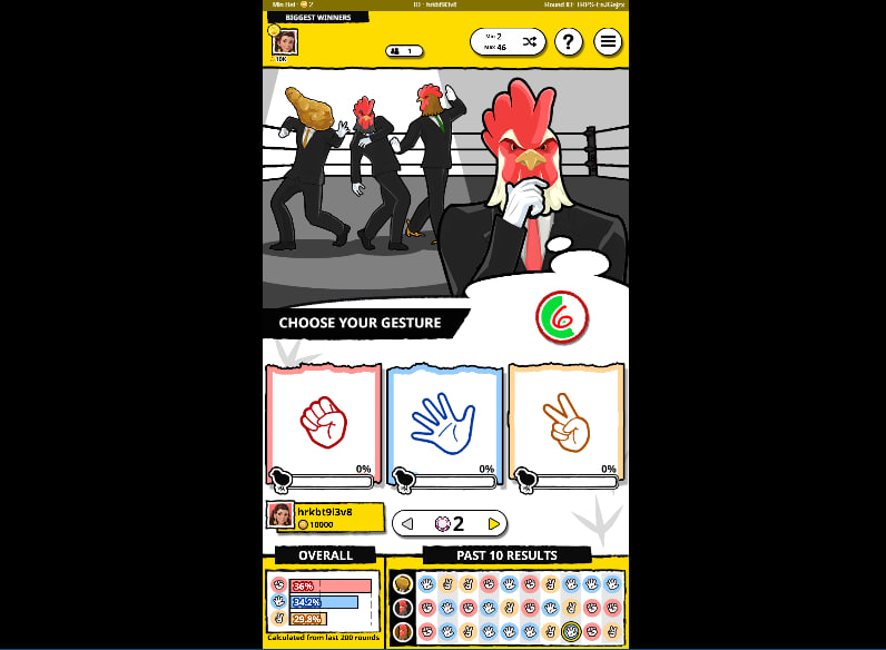 The overall presentation leans towards a minimalist yet impactful style. There are no elaborate background narratives or overly complex animations. Instead, the focus is on the immediate action: the selection of Rock, Paper, or Scissors, and the subsequent reveal of the opponents' choices. This directness is a strength, allowing players to quickly grasp the gameโs flow and concentrate on the strategic elements introduced through the multi-opponent format and bonus opportunities. The imagery of formal chickens as opponents injects a unique brand of levity, preventing the game from feeling sterile while still emphasizing the competitive, decision-making core.