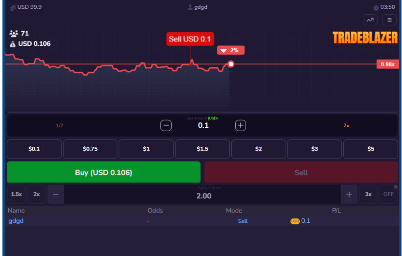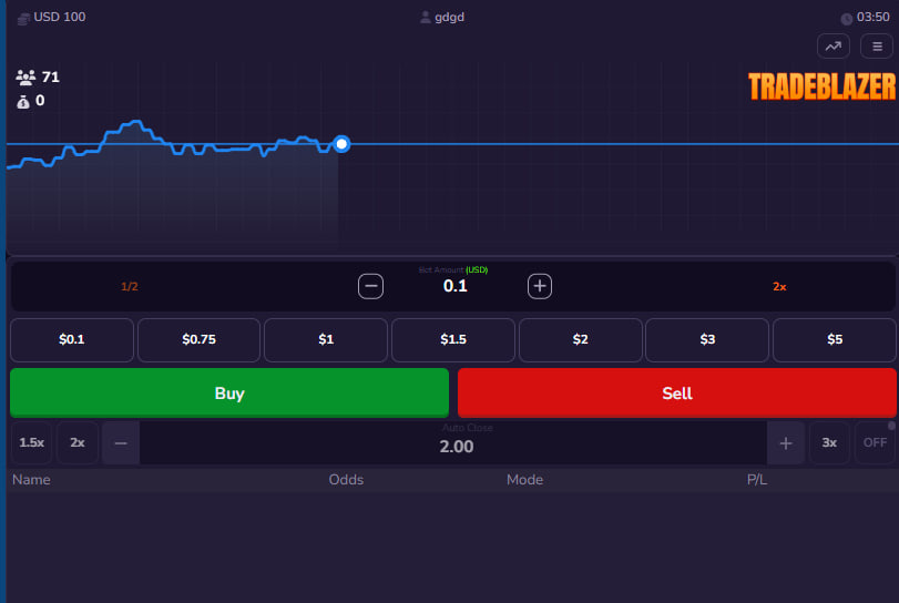 The game interface also incorporates a “Menu” tab, which presents a roster of other individuals concurrently engaged with TradeBlazer. This display lists active players, their chosen mode of operation (Buy or Sell), the odds related to their current or recent positions, and their profit or loss. While this information provides a communal context, its direct strategic utility for an individual's own trading decisions is likely limited to observing general sentiment, rather than offering actionable predictive insights for the highly volatile, short-term price movements central to the gameplay. The core challenge remains individual interpretation and anticipation of the graph's behavior.