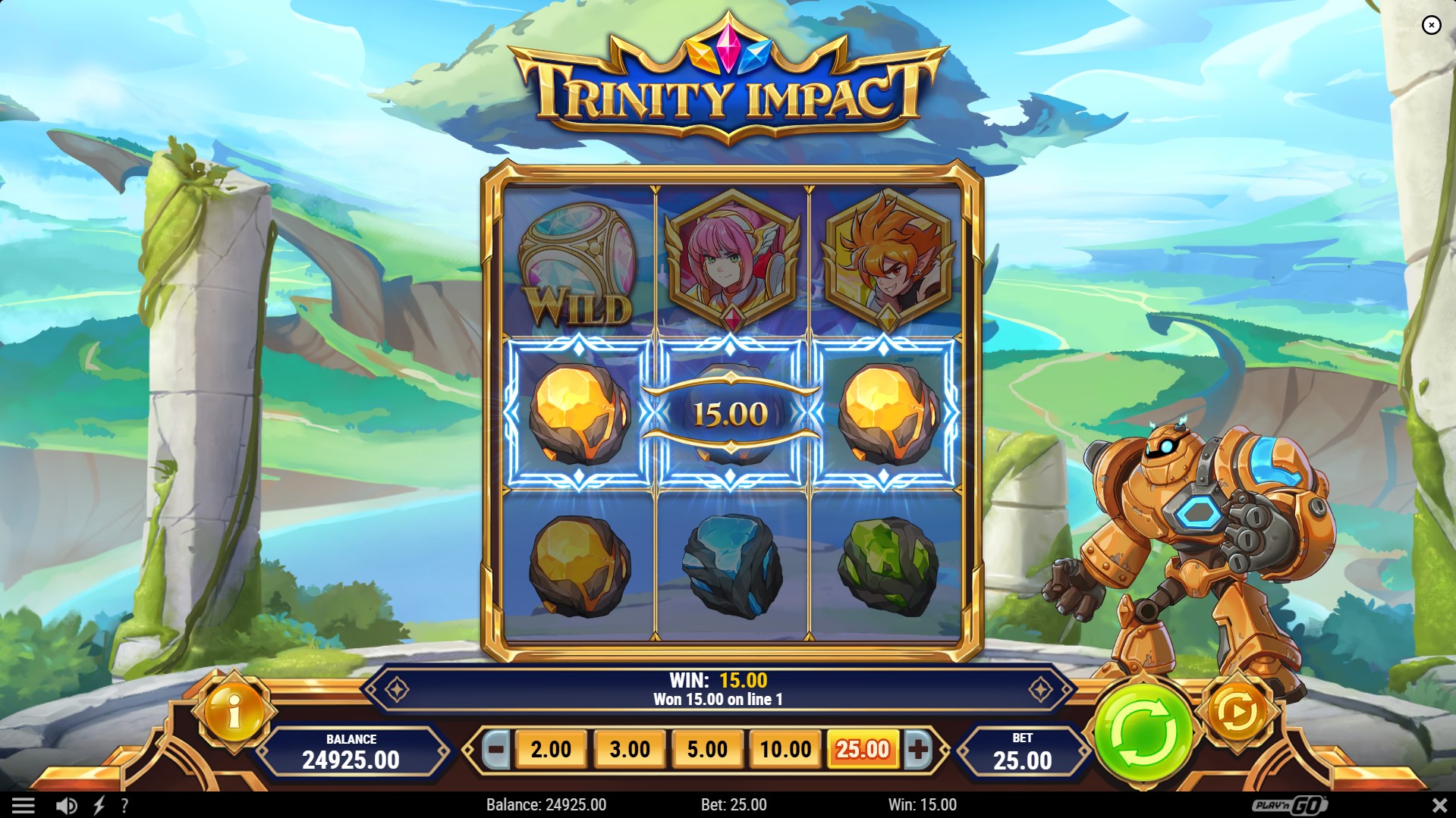 Trinity Impact's 3×3 grid and 5 fixed paylines might seem like a step back to a bygone era of slot design, but this simplicity is a conscious choice. This game targets players who appreciate a straightforward, uncluttered experience. The betting range is broad, starting at a mere 0.05 and scaling up to a substantial 100 per spin, accommodating both cautious players and high rollers.