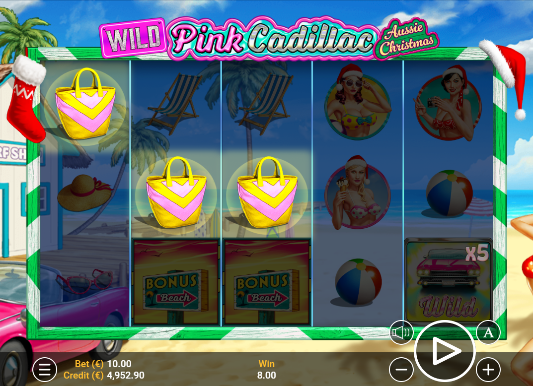The game's distinctive visual identity merges two seemingly contrasting themes – the laid-back Australian beach culture and traditional Christmas elements. Rather than snowmen and pine trees, players encounter beach chairs draped with tinsel and surfboards adorned with holiday lights. The pink Cadillac, beautifully rendered as the game's premium symbol, perfectly embodies this unique fusion, with its chrome trim glinting under the summer sun and subtle Christmas decorations adding festive flair.