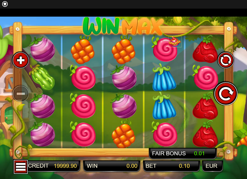 The symbols themselves are a collection of stylized fruits and what appear to be fantasy vegetables. They avoid photorealism entirely, opting for a smooth, glossy, candy-like appearance. For instance, the highest paying symbol is a pink, swirled object resembling a snail shell or a piece of hard candy, while lower-tier symbols include a geometric red strawberry, a purple bulbous fruit akin to a beet or turnip, and a cluster of orange orbs that look like cartoon raspberries. This artistic choice detaches the game from a simple “fruit machine” classification and places it more firmly in a light fantasy category. Animation is functional and clear; wins are highlighted with simple line animations and coin effects, and the WIN MAX symbol has a distinct visual cue when it locks and drops. The design prioritizes clarity of information over cinematic spectacle, which is a sensible choice given the game's mechanical focus.