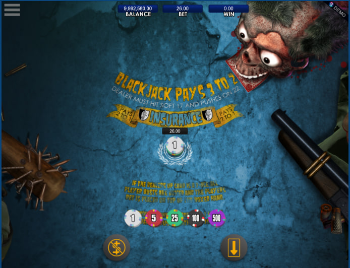 Zombie Blackjack leans heavily into its namesake theme, replacing the typical polished casino setting with a gritty, survivalist backdrop. The playing surface appears worn and stained, possibly resembling weathered metal or concrete, marked with crudely painted betting areas and rules summaries. Visual accents include a rather graphic zombie head leering from the corner, a bloody spiked baseball bat resting nearby, and a shotgun on the opposite side, firmly establishing the post-apocalyptic, undead motif. Even the playing cards feature a custom “Zombie Blackjack” logo, ensuring thematic consistency.